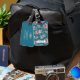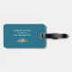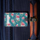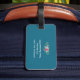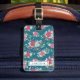 Dark teal luggage tag with a pattern of pink roses, blue flowers, and cherry blossom. Personalise with your name on the cover, and name and address on the back.