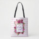 A tote bag personalised with a monogram letter on the back and the word Bridesmaid, on the front. With a little pink heart. Designed with a floral bouquet composed of light pink roses and dark pink poppies with lots of lush green leaves. A frame layered over top to put your personalised text inside. The background is a soft pastel pink striped pattern.