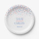 Beautiful stylised graphic confetti scattered dots add your own wedding names and wedding date paper plates. A great personal addition to your wedding tables or for after wedding drinks or a wedding after party. Personalise with your bride and groom's names. Perfect for a pink rose quartz and serenity blue themed wedding, engagement, or anniversary. Original art and design by Sarah Trett.