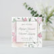 Announce your upcoming wedding date with modern elegance. The pink roses and greenery fills the background, while an overlay is centered displaying the couple's names, wedding location, and date. Behind the save the date info is a glimpse of the floral background.