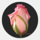 Stickers with a closeup of a beautiful pink rosebud on a black background. Very pretty on the backs of cards or invitations! Digital photography by Sue Melvin