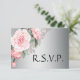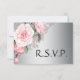 A modern pink and silver wedding RSVP with a traditional touch: a beautiful bunch of pink roses in the top left corner. In the background there is a shiny silver metallic base. The reverse also has a tiny pink rose bouquet at the bottom.