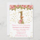 Pink Roses Floral 1st birthday party invitation for a 1 year old girl with modern script writing and gold glitter.