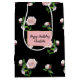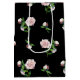 Chic gift bag done black with a painted looking pink rose pattern. A pink and gold tone text area, on the front of the bag, has custom text ready to personalise for your occasion. Great for birthdays, weddings, showers and more.