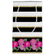 Features a lovely pink rose border, and a horizontal stripe pattern in black, white and gold.