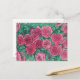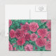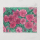 Postcard featuring delicate floral art, blooming rose flowers in a garden. Pink, rose, mint and emerald green colours.
