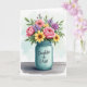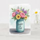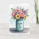 Designed with an overflowing bouquet in a teal glass jar, this illustration sets a tender, affectionate tone like a gift left for someone special ❤️. The jar sits centered on a lightly textured, rustic wooden surface, grounding the scene with a cozy, homey feel. Above it, lush pink roses open in soft layers, their petals leaning into one another as if sharing a quiet moment. Sunny yellow, daisy-like flowers cluster nearby, adding cheerful warmth that feels like a friendly smile across the table 🌼. Small purple, hyacinth-like blooms and scattered pale pink petals weave between the larger flowers, creating gentle movement among deep green leaves. The background is a light watercolor wash of pale blue and green that keeps everything airy while the bouquet stays the focus. A short message appears on the jar, placed on the front in small, light-colored lettering that contrasts against the cool teal glass, with the flowers filling the upper half of the card. The glass catches soft, diffused highlights along its curved rim and sides, and the weathered wood grain runs horizontally beneath it.