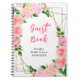 This fun and whimsical bridal shower guest book notebook features watercolor pink roses and foliage on a gold geometric frame. The text combines handwritten script and serif fonts for a stylish and modern look. This is perfect for a spring or summer rustic bridal shower.