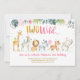 This cute birthday invitation features watercolor safari animals with floral and leaf accents and faux gold foil confetti.