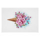 Sweet waffle cone with fresh, pink Japanese cherry blossoms on white background with blue watercolor streaks. Pink Japanese cherry.