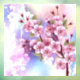 Artistically drawn, branch of pink, cherry blossoms on picturesque, textured background, painted over with white, pink and blue paint. Pink Sakura