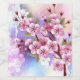 Artistically drawn, branch of pink, cherry blossoms on picturesque, textured background, painted over with white, pink and blue paint. Pink Sakura