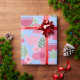 This wrapping paper has a Scandinavian design of flowers and leaves in various shades of pink and green on a field of blue.