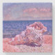 A beautiful pink Conch Shell seashell laying in the pink beige sand on the beach near the purple sea. This beautiful watercolor painting is depicting an amazing sunset at the beach with beautiful shades of pink and purple.