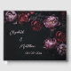 This dark floral romantic wedding guest book features 3D purple and dark red peony flowers on a black background.
