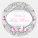 Baby Shower Sticker. Elegant silver rose design & pink jewel bow. Please note: All flat images!