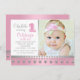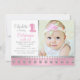 Girls pearl first birthday party invitation with pretty pearls on a pink and silver grey background. You can easily customise this cute pink and grey first birthday party invitation for your event by simply adding your details and photo. This is a printed design with no real pearls, bows, etc.