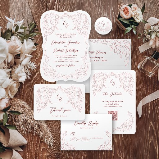 Elegant sketched vintage flourish frame with couple's monogram and stylish script font in dusty pink and burgundy red, modern and classy, great wedding programs for modern classic wedding, luxe vintage wedding and romantic formal wedding.