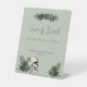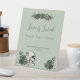 This elegant gothic Irish St. Patrick's Day Bridal Shower favours tabletop sign features hand-drawn Irish & gothic themed illustrations in black ink, showcasing a skull adorned with green roses, leaves, berries, wildflowers and green clovers. The back features a matching pattern with these same elements against the same pink background.