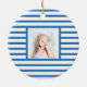 Elegant, modern and cute baby photo round ornament on navy blue stripe pattern. This template featuring an adorable illustration of Pink baby dinosaur sleeping under the gold yellow stars with custom Baby's name. Great for both baby boy and girl. Perfect gift for all seasons!