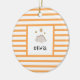 Elegant, modern and cute baby photo round ornament on orange stripe pattern. This template featuring an adorable illustration of Pink baby dinosaur sleeping under the gold yellow stars with custom Baby's name. Great for both baby boy and girl. Perfect gift for all seasons!