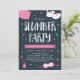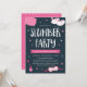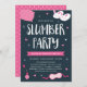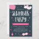 Invite friends to a slumber party with this cute pink birthday invitation featuring eye mask, nail polish, pillow and slippers surrounded by hearts and stars against a dark blue background on the front with a pink polka dot back side.