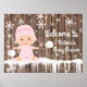 Pink snowflake baby shower sign poster with adorable baby girl wearing a pink snow outfit on a rustic wood and snowflake background. Simply add your details and poster board to the back and sit on a stand or easel.