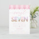 Celebrate your toddler's milestone with this "Sweet to be Seven" ice cream parlor birthday invitation. This adorable design features watercolor sprinkle typography, a classic pink awning, and a whimsical sundae aesthetic. Perfect for a summer ice cream social, this cheerful invite is easily personalized to scoop up some fun for your daughter’s third birthday party.