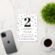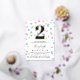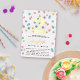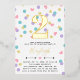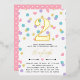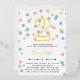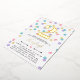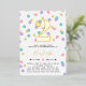 Cute confetti birthday invitation in gold foil and white with colourful confetti shaped like dots, hearts, and stars in pink, yellow, purple, and turquoise. Add your child's name and age in gold foil.