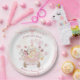 Get ready to stomp and roar with all the pink dinosaur fans at your child's birthday party! Hand-painted watercolor dinosaurs in a jeep with party bunting, balloons, butterflies and dragonflies and pretty pink ribbon too. Easily change the details on this plate and change font style, colour size and placement if you would like to.