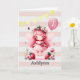 A pink fairy 7th birthday card, which can be personalised with her name and age. Features pink, gold and a strawberry fairy girl with a pink balloon on the front. The inside card message can be also personalised if wanted. A personalised fairy birthday card keepsake for daughter, niece, granddaughter, etc.