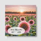 A vibrant field of pink sunflowers stands tall against the backdrop of a setting sun which casts a warm glow over the petals and leaves.