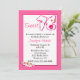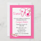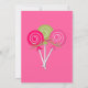 Pretty girl's Sweet sixteen birthday party invitation done in white, with a pink frame, around the edges. Graphics of pink, green, and white wrapped candy, decorate the bottom left of the invitation, on three suckers decorate the back. Whimsical polka dot graphic text, at the top, reads 16. Text in pink and black is ready to personalise for your daughter's special birthday. Sweet girly invitation she will adore.