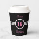 Elegant pink sweet 16 with white stripes on black Birthday Cups. Text can be personalised for other ages, Birthdays, company meetings, business, party and more!