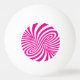 A professional white table tennis ball featuring a unique, pink geometric swirl pattern that creates a fluid, kinetic visual effect. The ball is perfectly centered on a blue table tennis court with a soft-focus net in the background, highlighting the intersection of athletic precision and modern graphic branding.