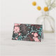 Place cards with an elegant pattern made with pink flowers, teal leaves, and red berries on a dark background.