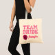 Fun wedding party canvas tote bag with pink graphic distressed text reading Team Bride. Custom pink script text, on the bottom, is ready to personalise for the whole bridal party. Digital graphics of a pink rose bloom decorates the bottom left. Perfect for holding all the important little things the bridal party members can't forget.