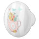 Ceramic door knob with a whimsical illustration. A pink teapot with a little pink heart in the centre and a bouquet of flowers inside. Delicate pastel coloured butterflies fluttering about. Set on a grey and white striped background.