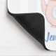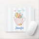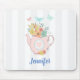 Personalised mousepad with a whimsical illustration. A pink teapot with a little pink heart in the centre and a bouquet of flowers inside. Delicate pastel coloured butterflies fluttering about. Set on a grey and white striped background.