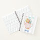 A spiral notebook with a whimsical illustration. A pink teapot with a little pink heart in the centre and a bouquet of flowers inside. Delicate pastel coloured butterflies fluttering about. Set on a grey and white striped background.