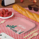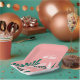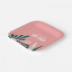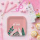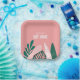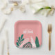 Tropical baby shower paper plate with tropical leaves in shades of pink and green.