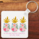 This cute personalised keychain features preppy pineapples of tropical pink flowers and gold. Personalise with your choice of name and special text on the front and back.