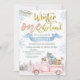 Girls winter onederland first birthday invitation featuring some woodland animals in a pink truck, blue banner, pine trees and snowflakes.
