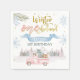 Girls winter onederland first birthday paper napkin featuring some woodland animals in a pink truck, blue banner, pine trees and snowflakes.