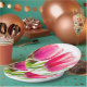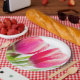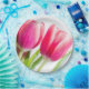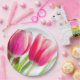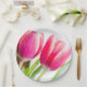 Paper plates with a beautiful spring photograph featuring 2 pink tulips and bright green leaves.