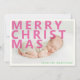 Celebrate your first Christmas with a stylish and modern touch. This minimalist holiday photo card features a bold Merry Christmas in transparent pink sans-serif letters placed over your favourite newborn or family photo. A custom family greeting in elegant transparent green text anchors the bottom, making this card both unique and heartfelt. Designed for light-toned images, the transparent overlay lets your loved ones' faces shine through while maintaining a clean, contemporary aesthetic. Perfect for new parents or families wanting to share holiday joy with a modern twist.
