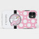 Cute and classy iPhone 5 Case designed in a pink and white assorted polka dots pattern, with an adorable mythological, magical, white and pink Unicorn, and custom printed with your name or personalised text.