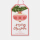 This vintage Christmas ornament design brings all those good nostalgia vibes from days gone by. The front of this gift tag features a pink blown glass ornament tied onto a branch with a coordinating pink bow. The back of the card has a coordinating pink and red background pattern. There is a red Merry Christmas greeting in a hand lettered style and below is a place to personalise with your name.