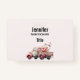 Name tag with a cute whimsical watercolor illustration. Peach and pink colours. Pickup truck with an old fashioned wood back/bed with cherry blossom flowers.