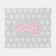 This fun volleyball themed fleece blanket features the text, "The volleyball court is my happy place" in pink in a cute, casual, handwritten style font - the background is light grey with a pattern of smaller white volleyballs - her name and monogram are customisable - by katz_d_zynes